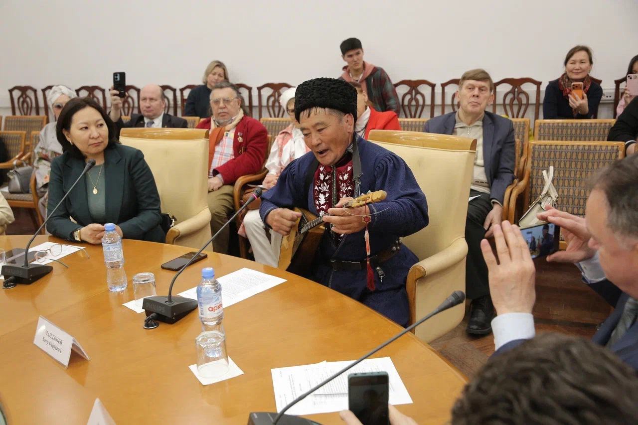 С докладом на круглом столе выступил народный джангарчи (сказитель), заслуженный работник культуры Республики Калмыкия, лауреат национальной премии «Келни билг» Манджиев Батр Каруевич с рассказом об эпосе и его исполнении на народных инструментах Калмыкии.