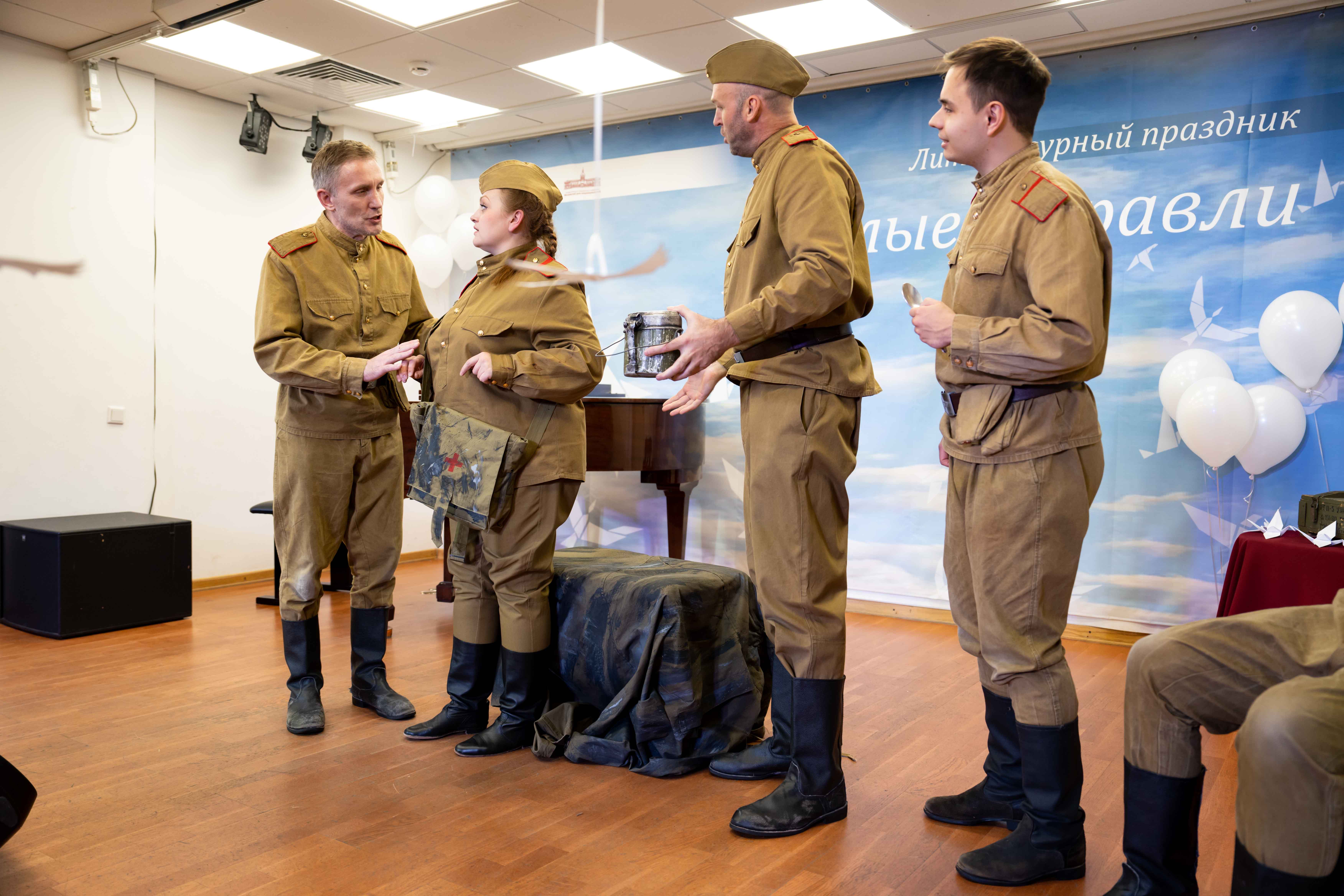 Артисты театра «ПОКОЛЕНИЕ» Александр Миненко, Руслан Киршин, Александр Манохин, Дмитрий Полкопин, Юлия Киршина представили на сцене ГБУ «МДН»  отрывок из спектакля  по мотивам повести Василя Быкова «Третья ракета».  Эта история о судьбах молодых солдат, которых война свела в одном окопе. Им нужно было выстоять и отбить атаку врага.