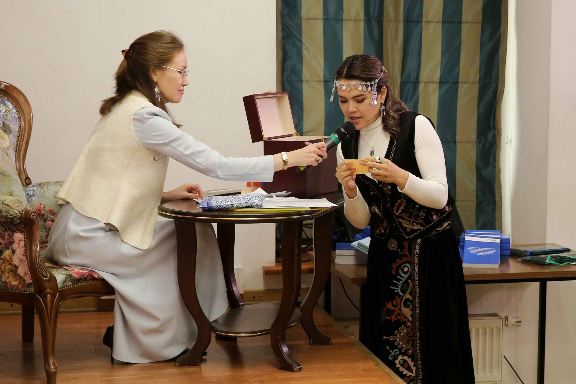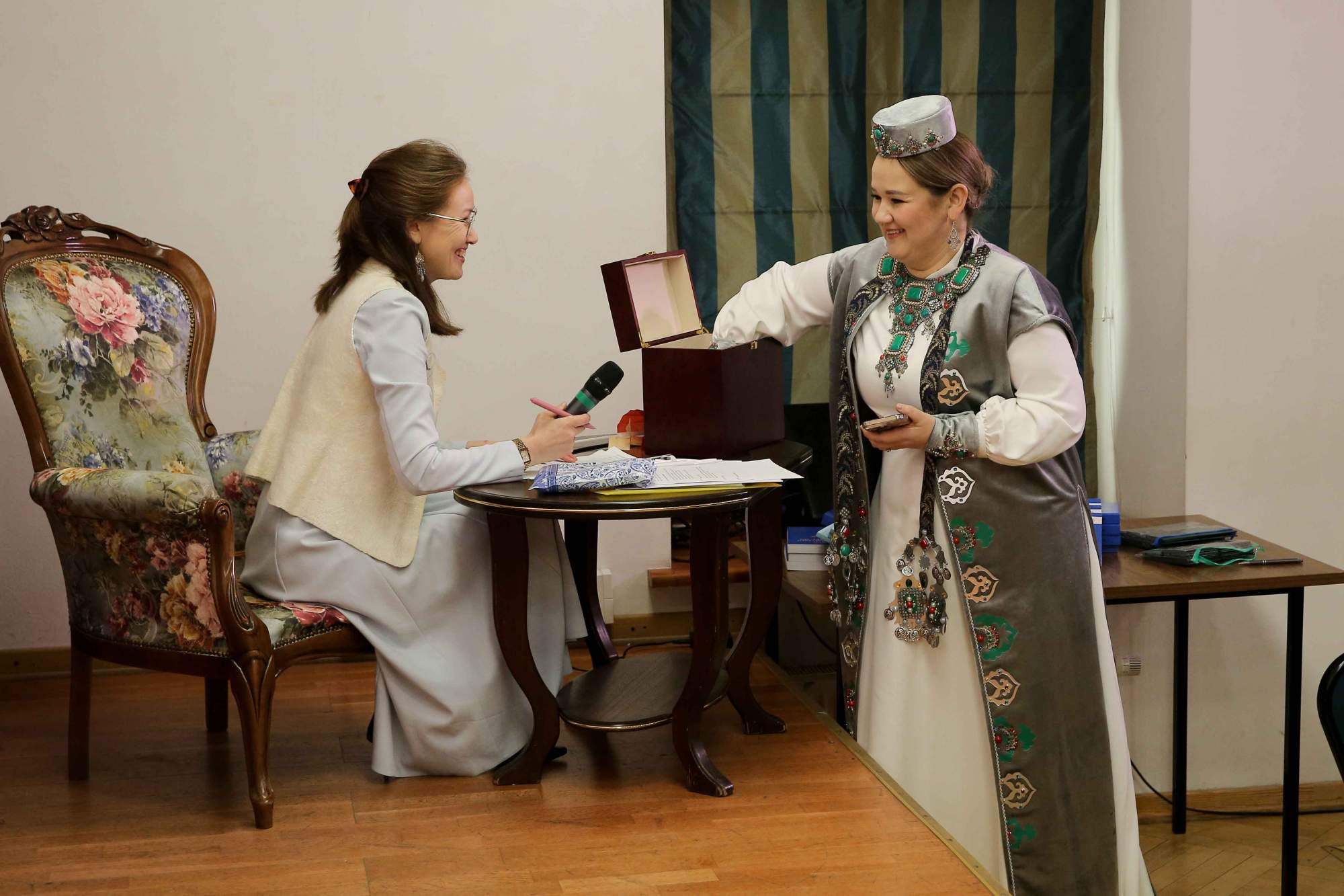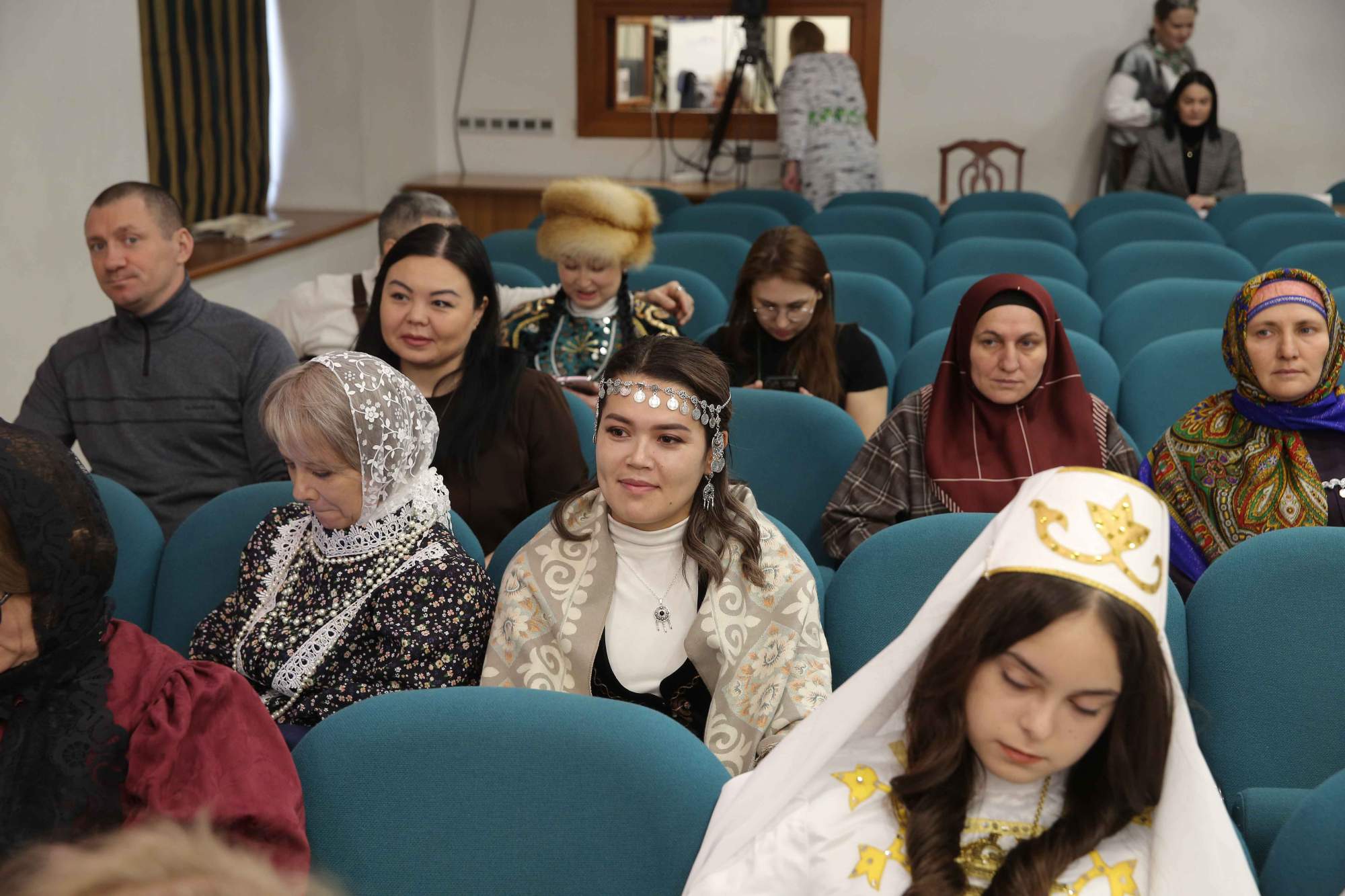 Основное содержание мероприятия было посвящено конкурсным испытаниям: участники провели мастер-классы в формате элементов уроков по русскому и другим родным языкам. Яркой и содержательной частью программы стала демонстрация национальных костюмов, где каждый выступающий представил традиционный наряд, дав подробное объяснение его культурного и символического значения в контексте народных традиций. Одновременно с конкурсными выступлениями работала выставка, на которой были представлены методические материалы, авторские разработки к урокам, а также предметы материальной культуры народов России, подготовленные и привезенные участниками из регионов страны.