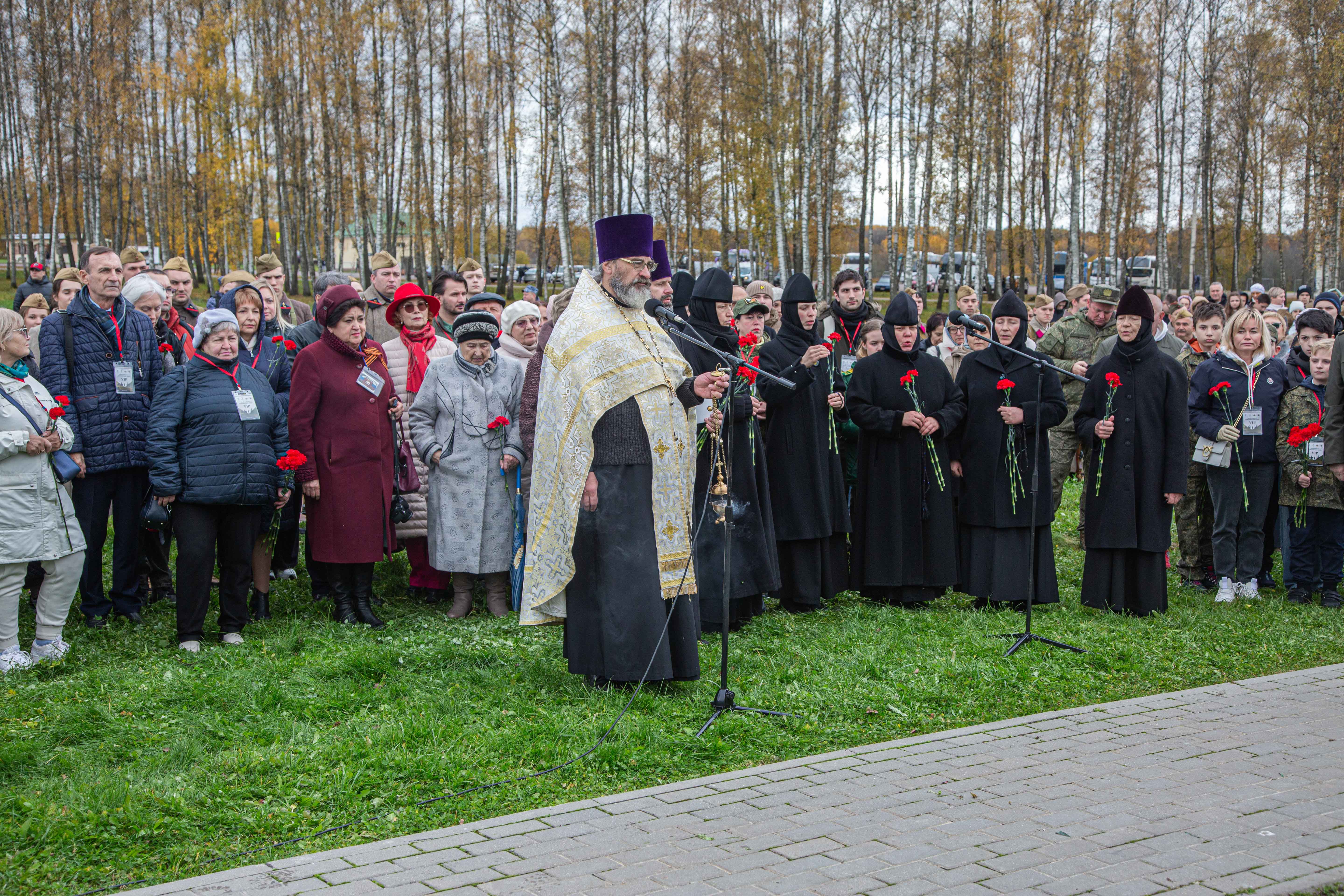 С приветственными словами выступили: директор музея-заповедника «Бородинское поле» Корнеев И.В.; генерал-лейтенант, председатель правления НП «Томское землячество» Шабанов А.М.; начальник отдела музеев Департамента музейного дела и поддержки циркового искусства Новикова Г.Н.; депутат Московской областной Думы Сердюкова Татьяна Владимировна; директор музея «Прохоровское поле» Кургановский К.С.; внук маршала Леонида Александровича Говорова – Говоров А.С.; внук Героя России (посмертно), командира 32-й стрелковой дивизии Виктора Ивановича Полосухина – Поняков В.И.; командир взвода 144-й дивизии майор Кулагин А.В.; полковник 32-й стрелковой дивизии Евгений Георгиевич Ходысько. В завершение церемонии настоятель Никольского храма отец Иоанн, награждённый за вклад в сохранение исторической памяти, совершил литию «Вечная память». Участники почтили минутой молчания память героев и возложили венки и цветы к мемориалу.