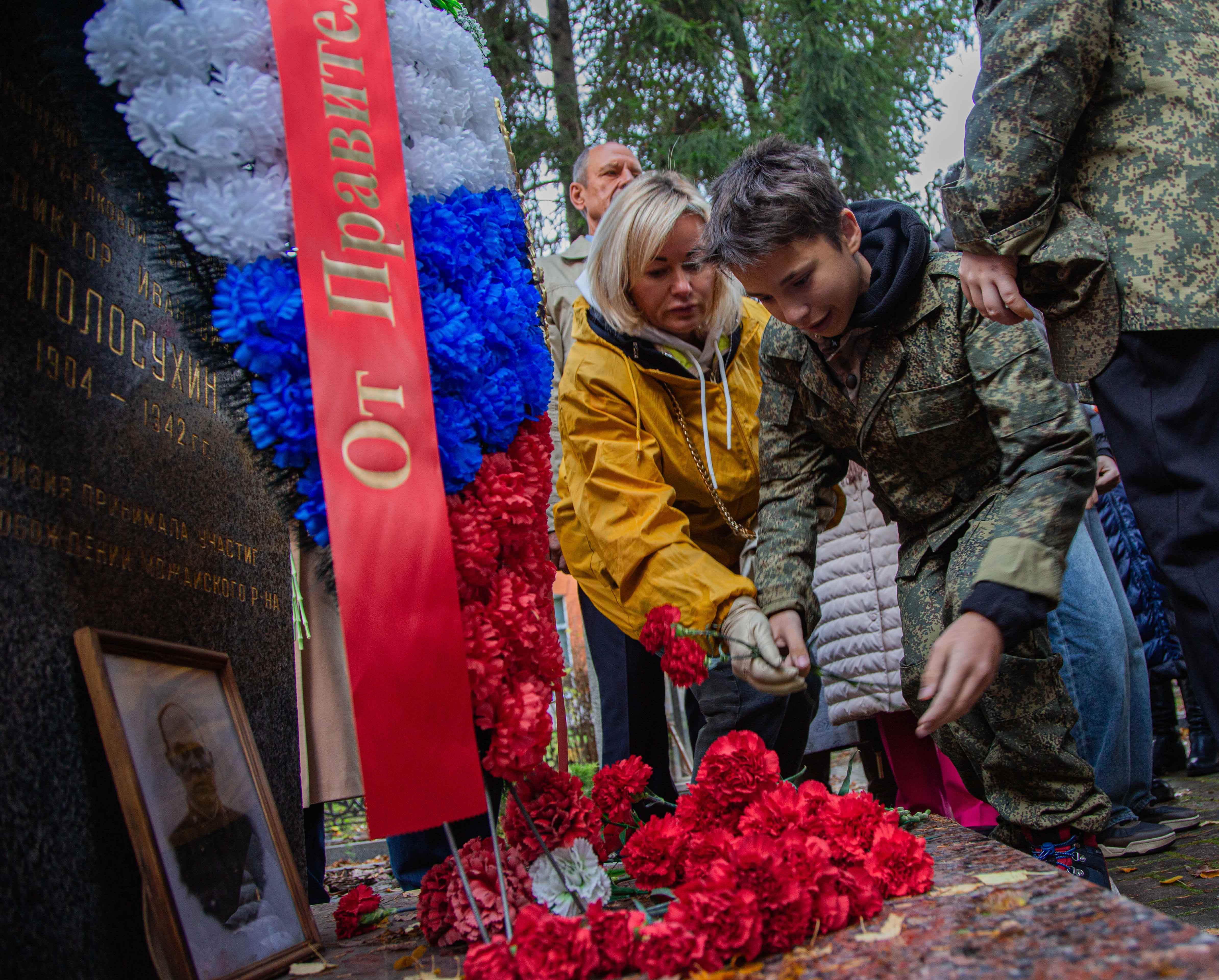 Затем делегация отправилась в город Можайск, где возложила цветы на могилу Героя России Виктора Ивановича Полосухина и почтила память воинов Великой Отечественной войны у Вечного огня Мемориального комплекса «Героям Великой Отечественной войны».