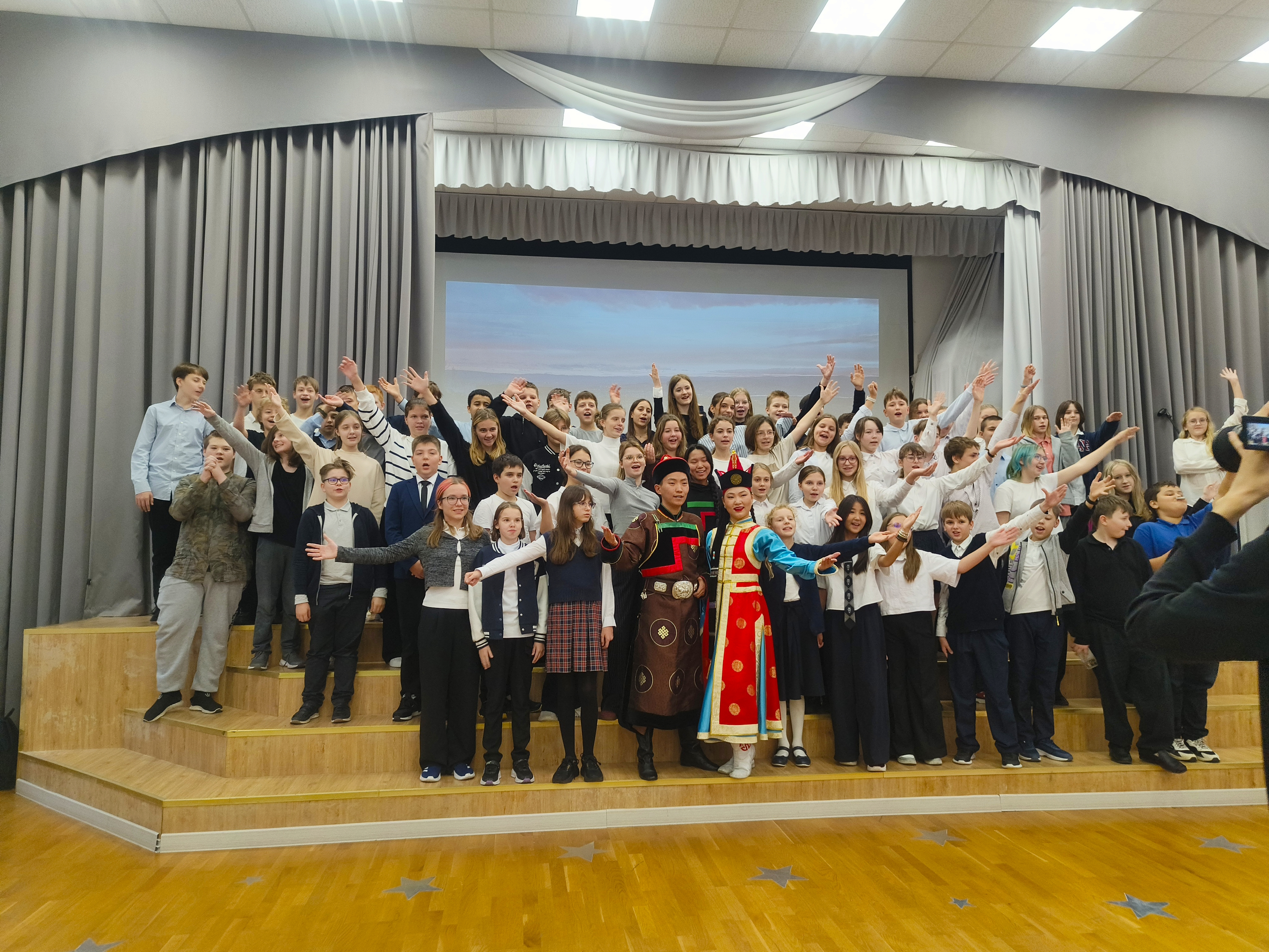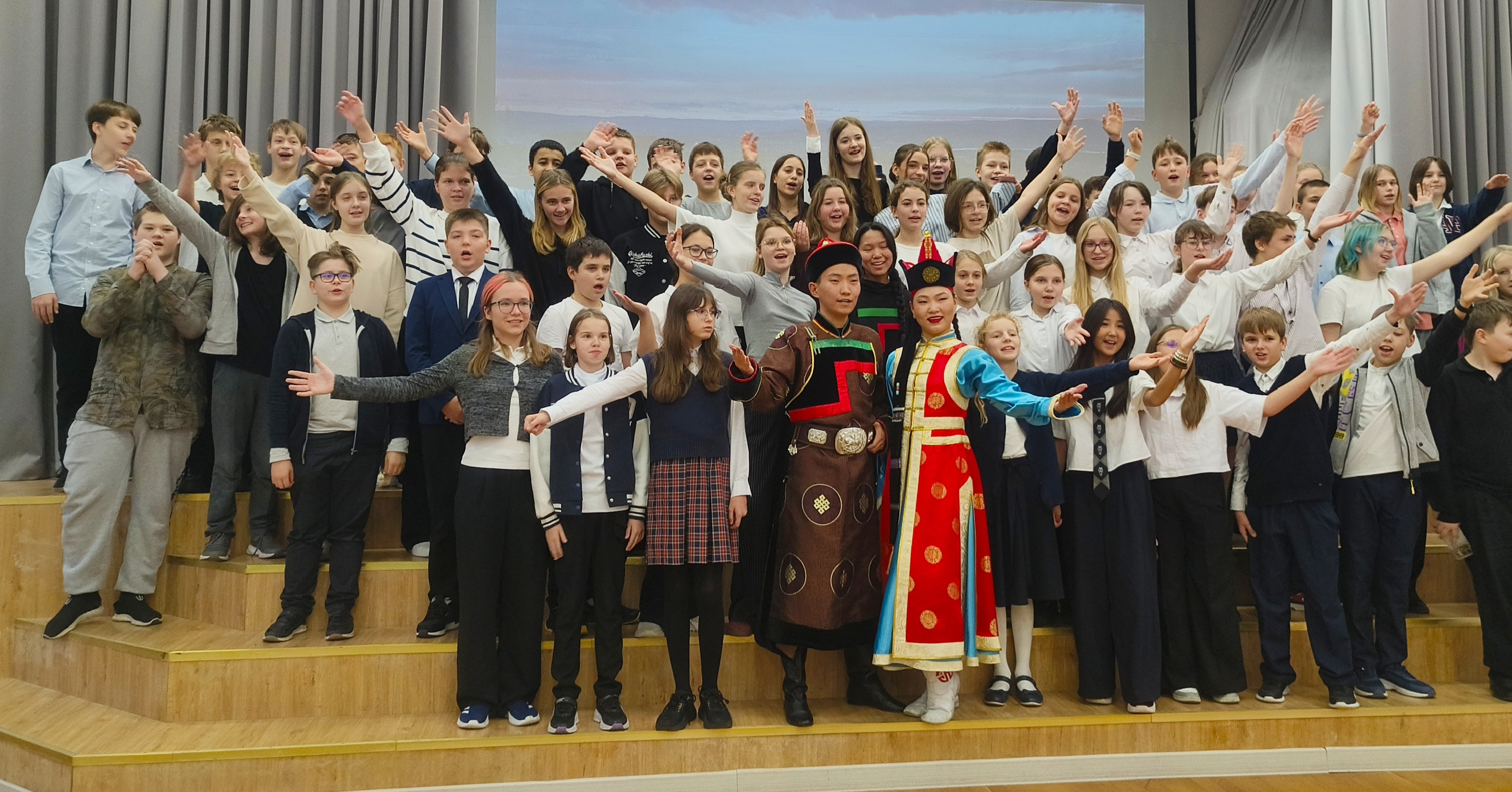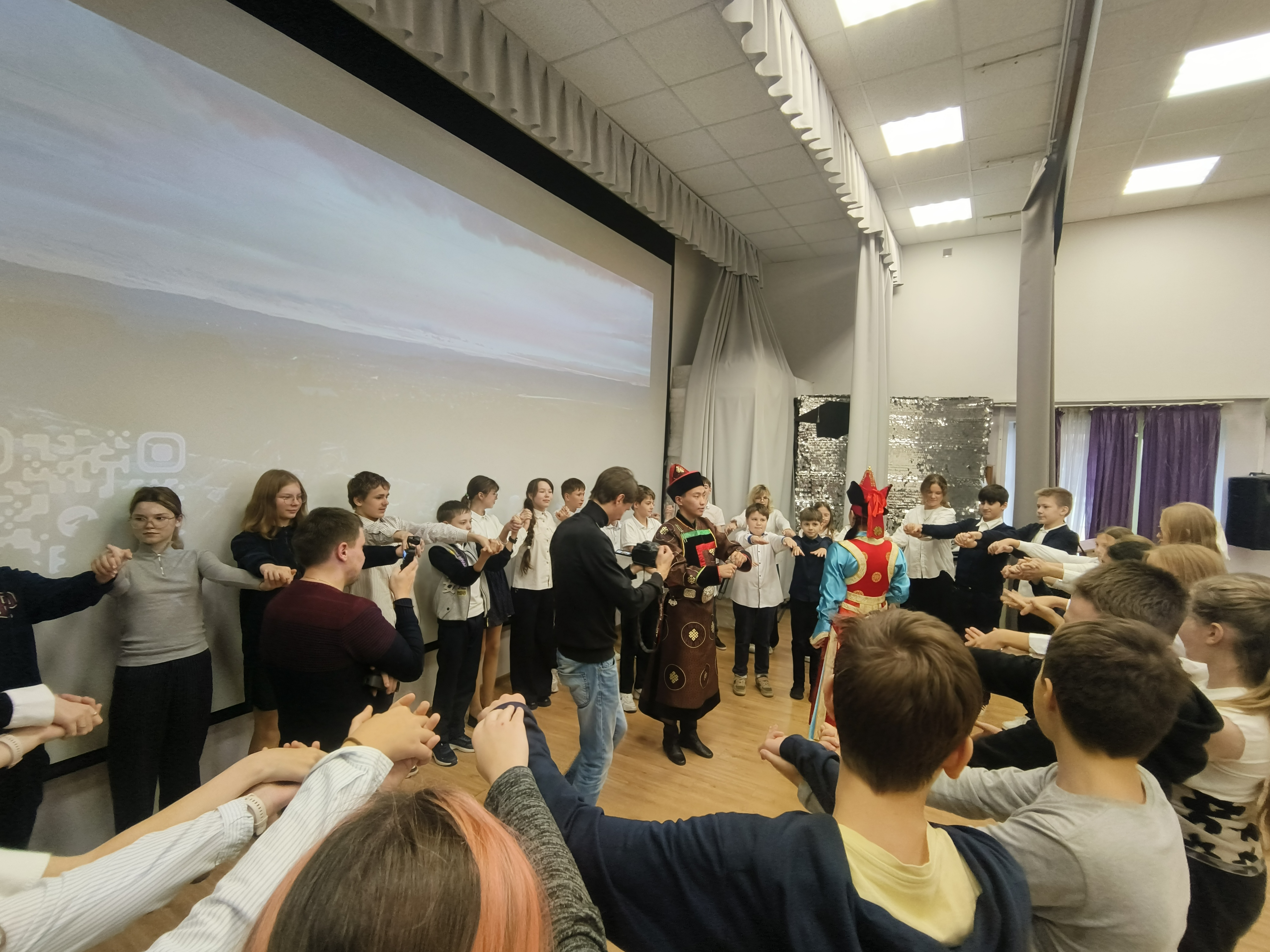 Школьникам также рассказали о культуре бурятов: о национальных музыкальных инструментах и познакомили с национальным танцем. Студия этно-танца «Буин Хан» исполнила бурятский национальный танец. После выступления всех желающих пригласили в хоровод для исполнения народного танца «Ёхор». Этот танец исполняется по кругу, все участники держатся за руки, выполняя определённые движения, которым их научили артисты.