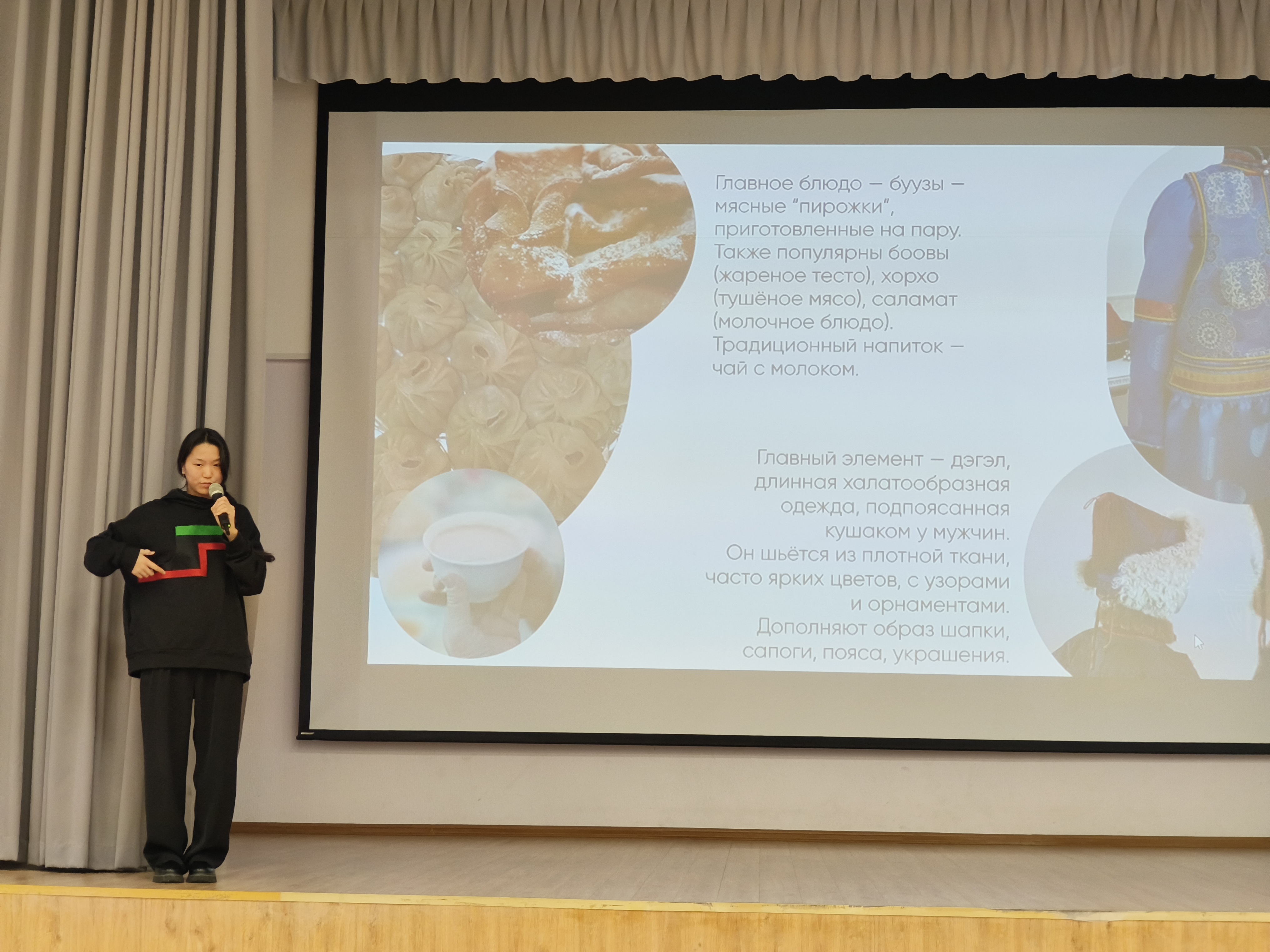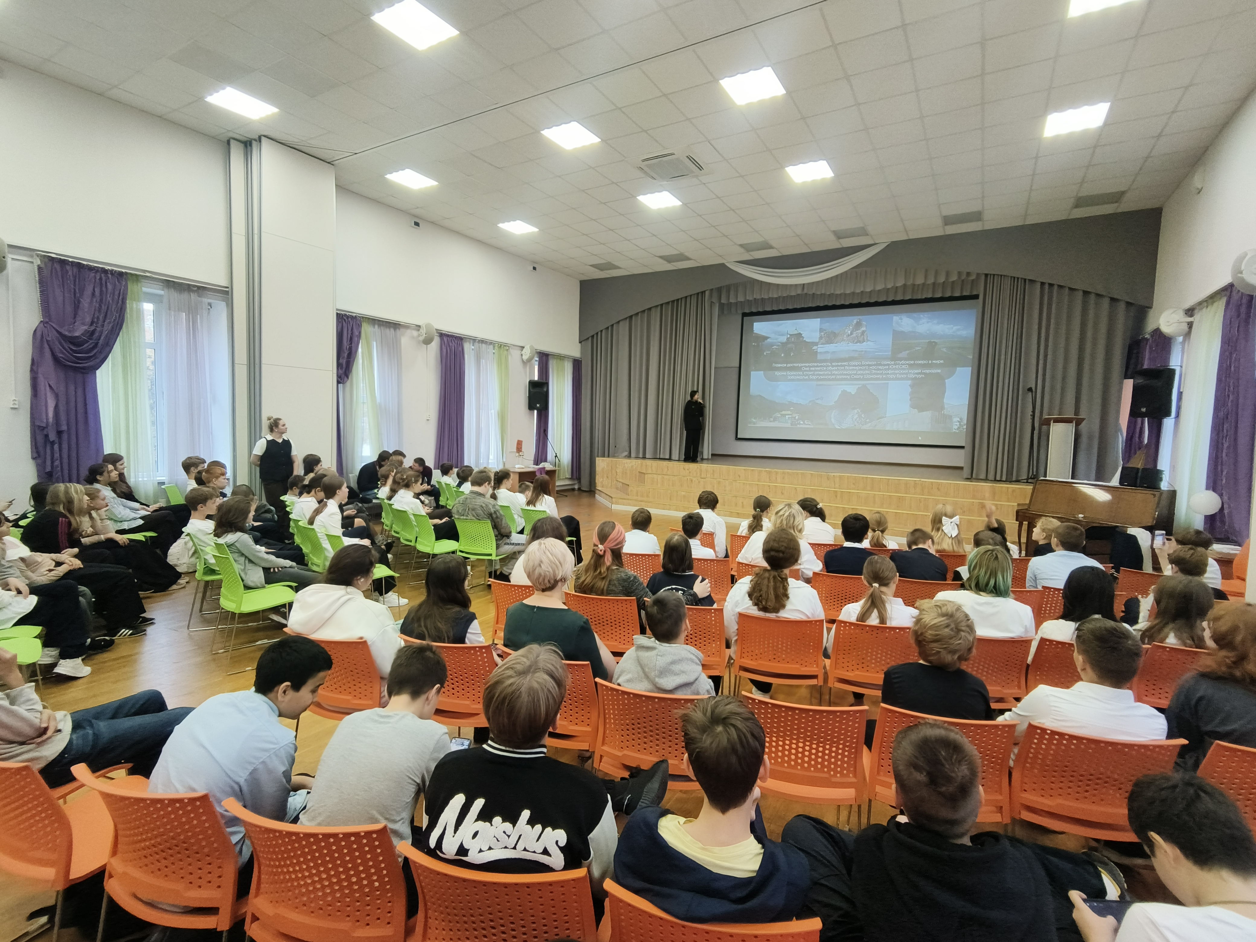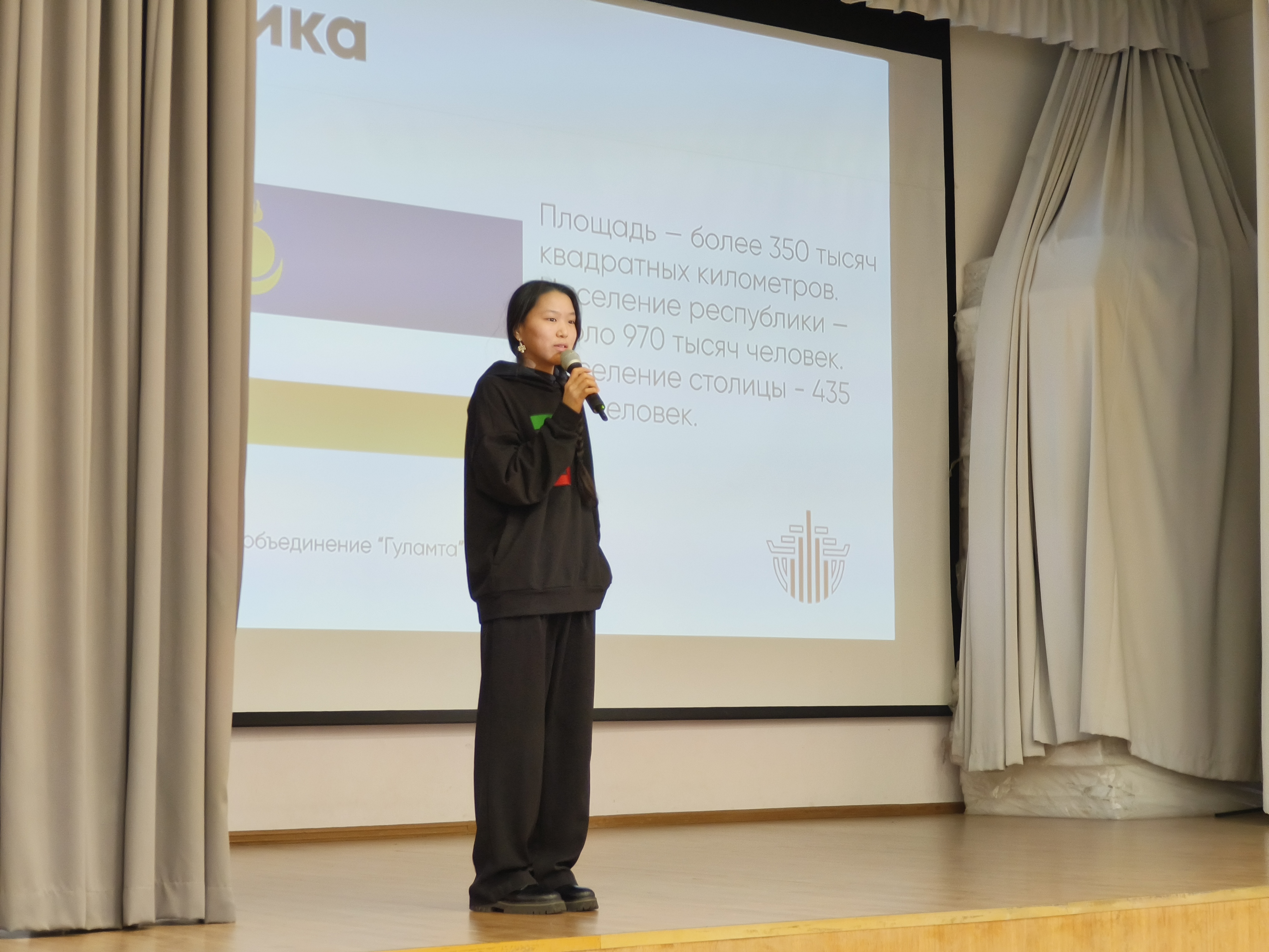Перед школьниками выступила эксперт-активистка студенческого объединения г. Москвы «Гуламта» Алтана Будаева. Алтана рассказала о Республике Бурятия и о значении её герба. На гербе изображены разные цвета, которые обозначают различные символы: жёлтый означает солнце, синий — цвет неба, а белый — цвет чистоты. Бурятия — солнечный регион. В Бурятии находится чистейшее глубокое озеро Байкал и Иволгинский дацан. Среди религий развиты буддизм и шаманизм.