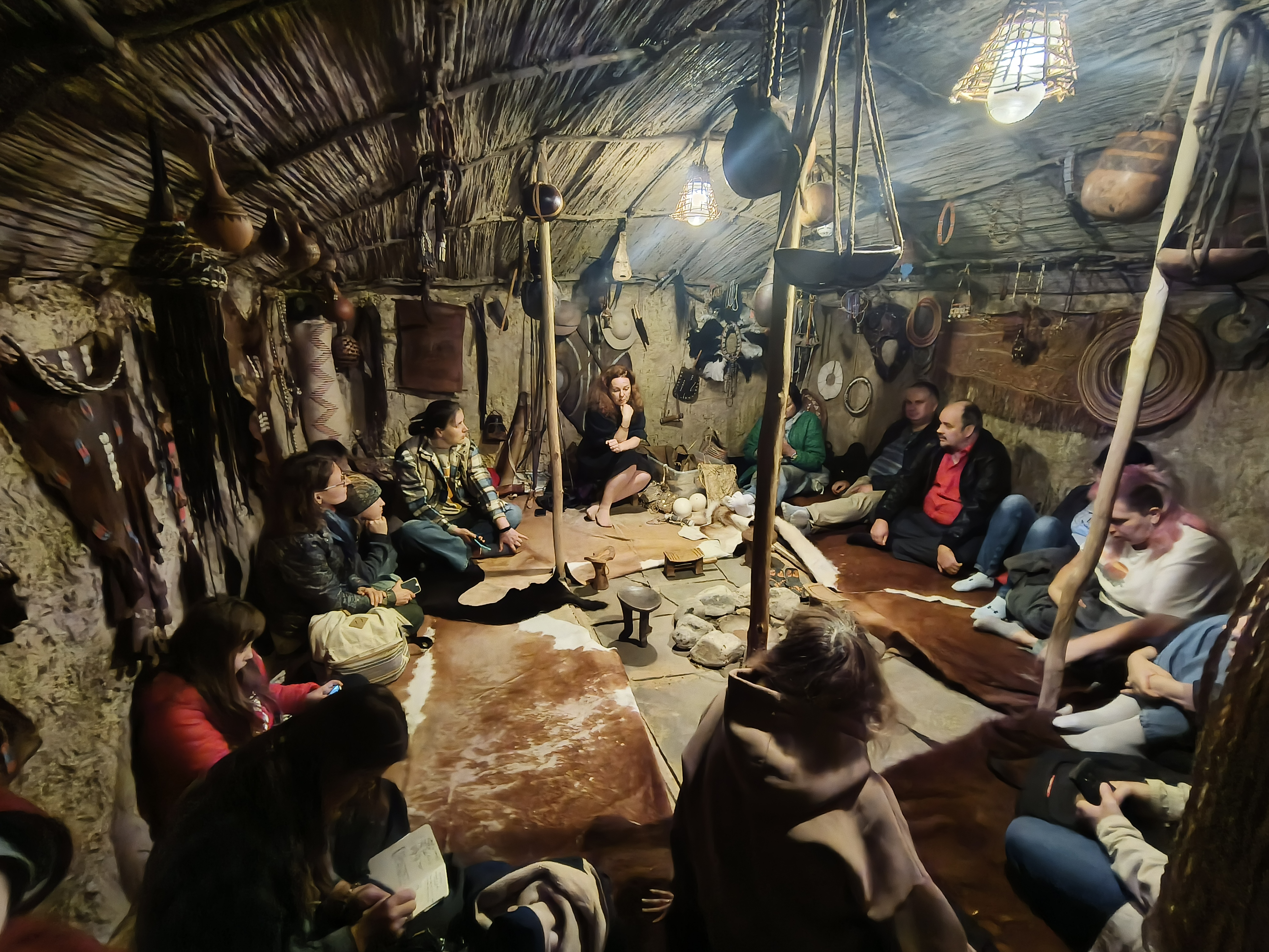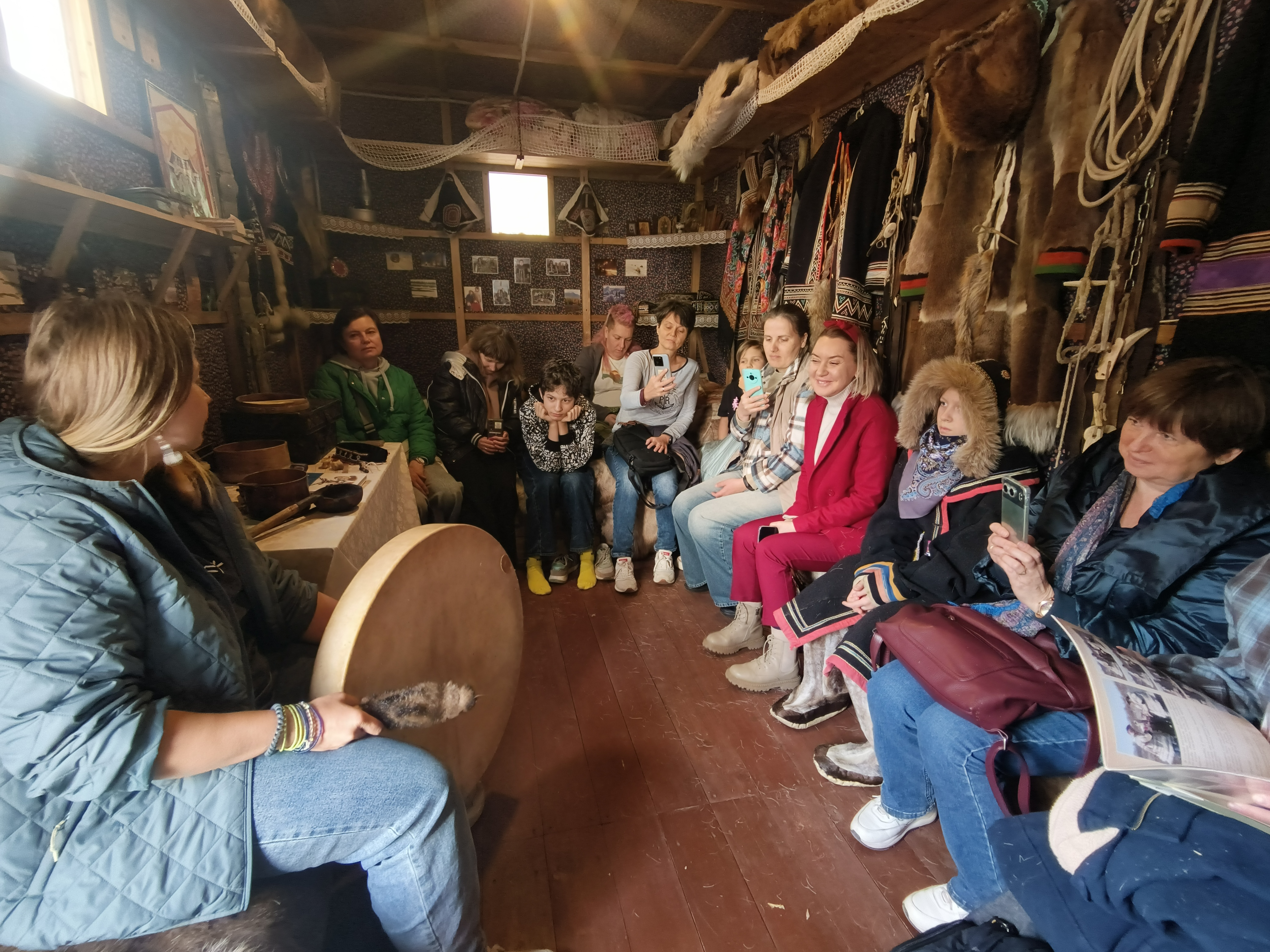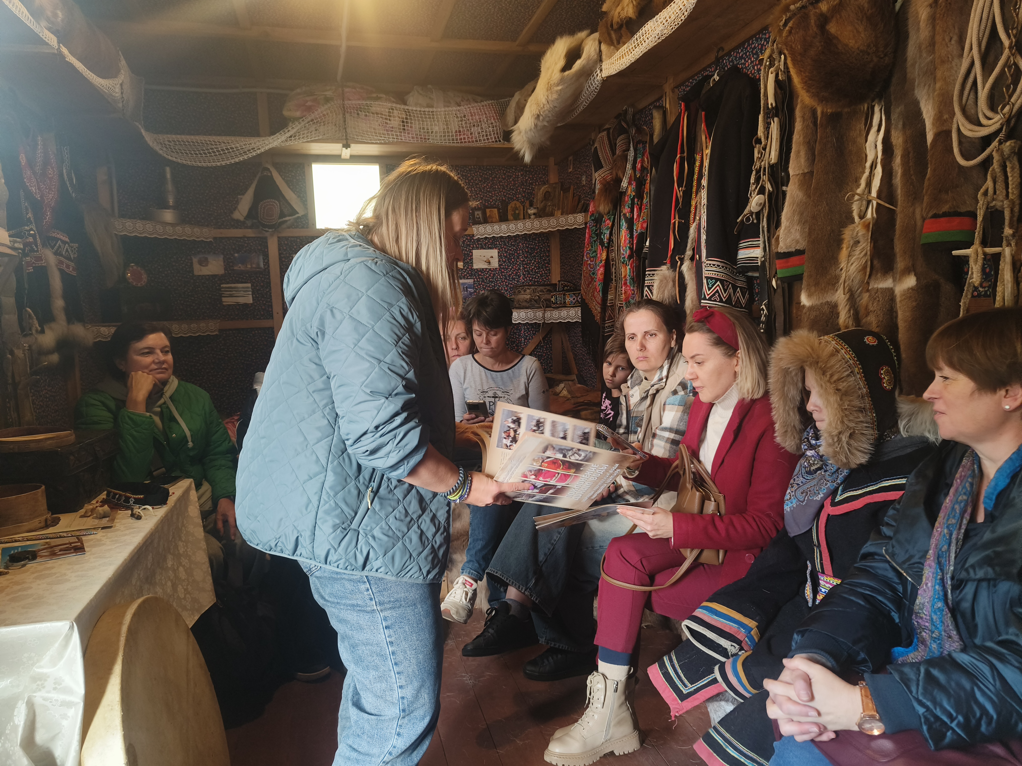 В начале семинара гостей пригласили в долганский чум. Жилище долганов называется «балок» — мобильный, передвижной дом. От 6 до 12 оленей используются для помощи с передвижением жилища, применяются также снегоходы. Долганы — самый молодой народ. Они являются переселенцами, и до 1970 года их причисляли к якутам, они говорили на якутском языке. Долганы переняли разное от других народов: от русского народа взяли за основу обустройство жилища, от эвенков — элементы одежды, у якутов — языковые особенности, но всё же они стали отдельным народом со своим языком и культурой. В основном долганы проживают на Таймыре. В своей национальной одежде они используют в качестве украшения различные бусы и павловопосадский платок (это такая особенность украшения у некоторых народов). Пояс является праздничным элементом одежды. На костюмах используются национальные узоры, которые являются не просто украшением и орнаментом, а защитой от злых духов. Обычно это узор, исполненный в виде треугольника. По поверью, этот узор означает трёх богатырей. Также украшения делают из копыт оленя, из них делают ещё искусство резьбы по кости. Олени у долганов являются домашними животными, едят они только диких оленей, и то предпочтительнее им в пищу другое мясо. Но при этом есть охота как со стадами оленей, так и просто отдельно людьми-охотниками. Охотники обычно делают подношение духам: мешок жира, хлеб и табак. Долганы верят в духов: нижний, средний и верхний миры. После увлекательной истории о долганах лектор предложила слушателям семинара сыграть в игру «Белый шаман»: нужно было на бубне повторить заданный ритм или исполнить свой. Лектор также подыграла на варгане.