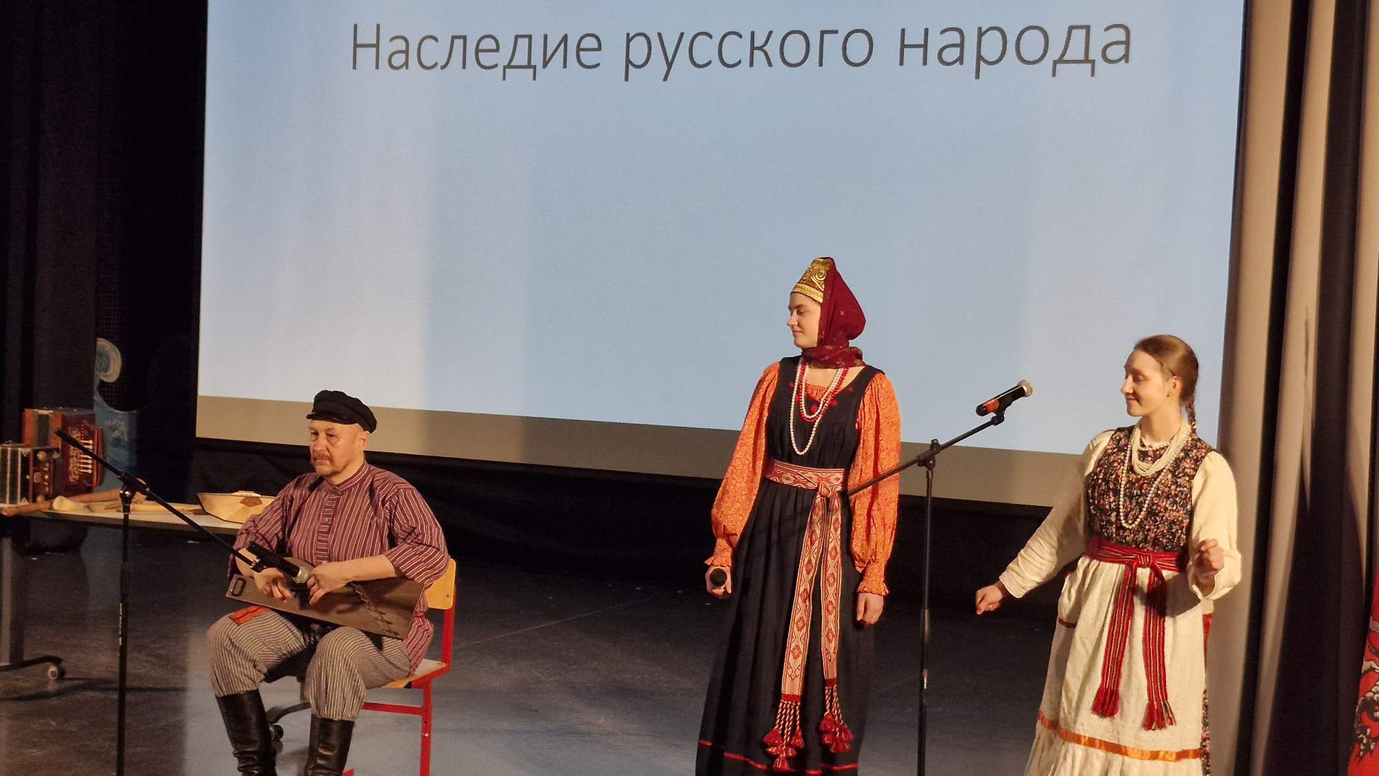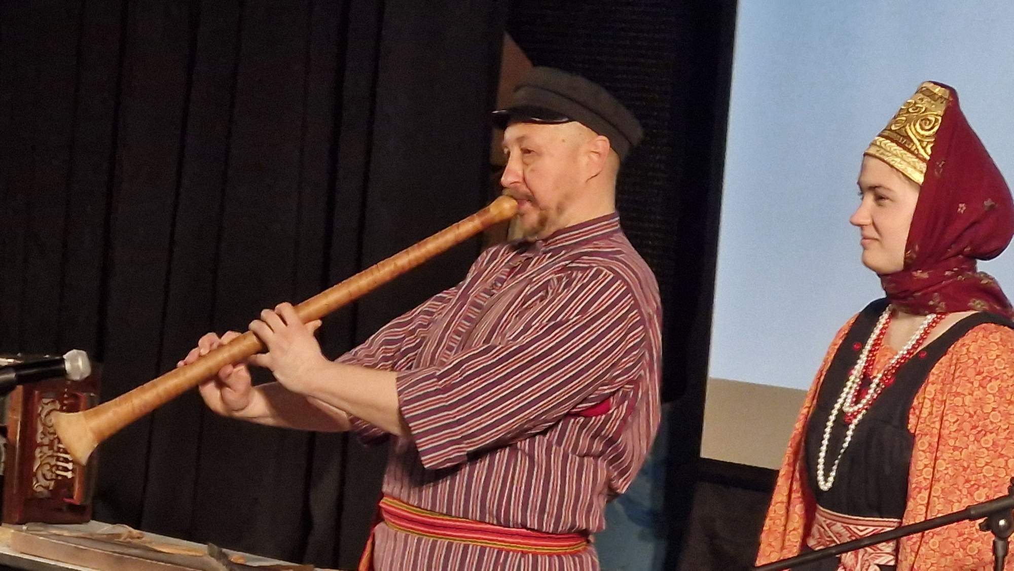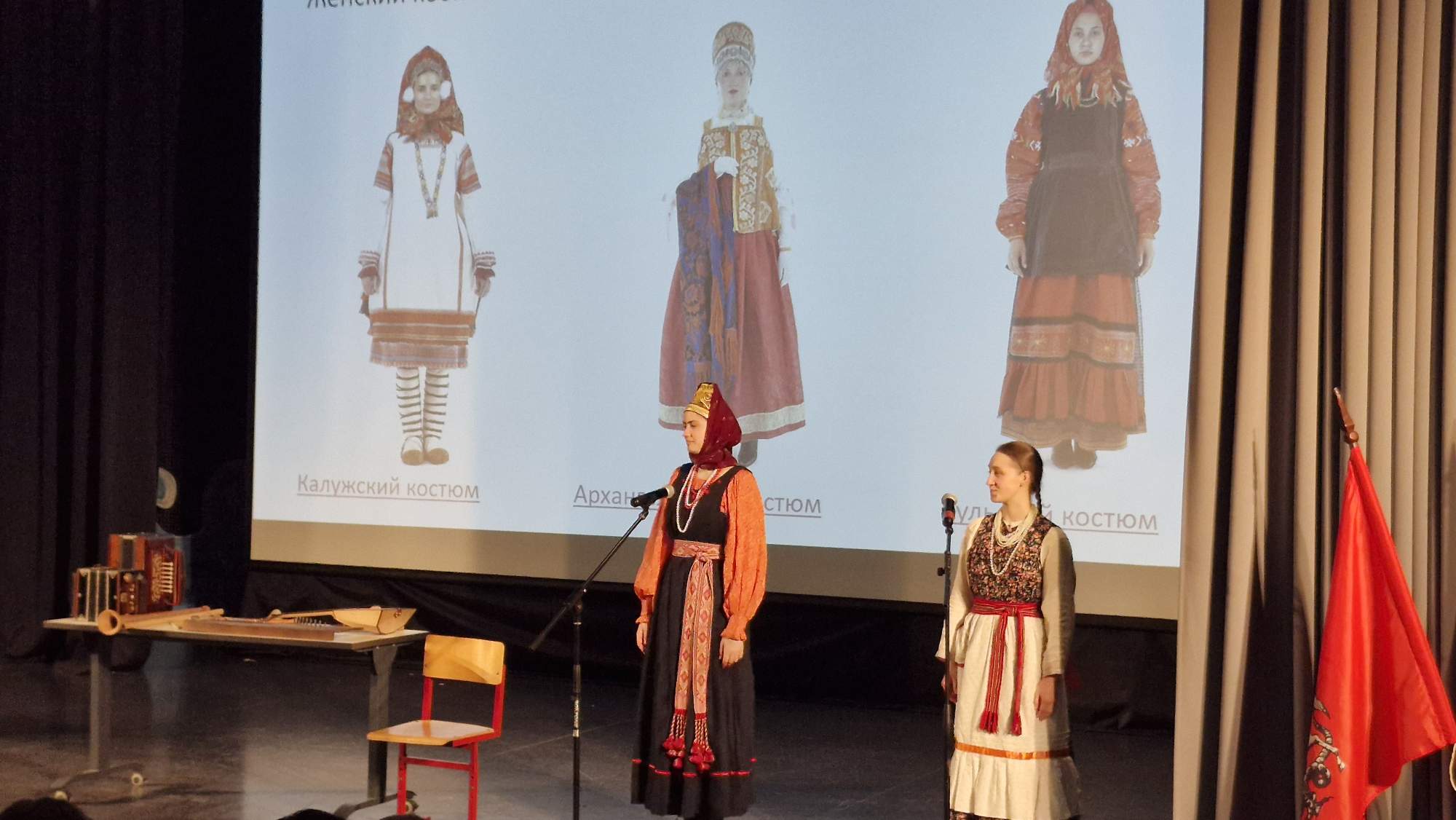 Музыка — то, что характеризует и раскрывает каждую культуру. В русской культуре популярны свои народные инструменты. Учащимся продемонстрировали игру на разных народных инструментах и рассказали про них. Кугиклы (кувиклы), наподобие флейты, делаются из тростниковых трубочек, используется камыш. Инструмент распространён в Брянской и Калужской областях. Рожок в основном использовался пастухами, чтобы загонять стадо, чаще изготавливали и использовали во Владимирской области. Гусли получили распространение в Орловской и Новгородской областях. В России существует около 30 разновидностей гармони, не все сохранились до наших времён. Учащимся школы представили елецкую рояльную гармонику. Припевки, наигрыши под гармонь назывались «Страдания», хотя это вовсе не означало что-то грустное, но носило такое название.