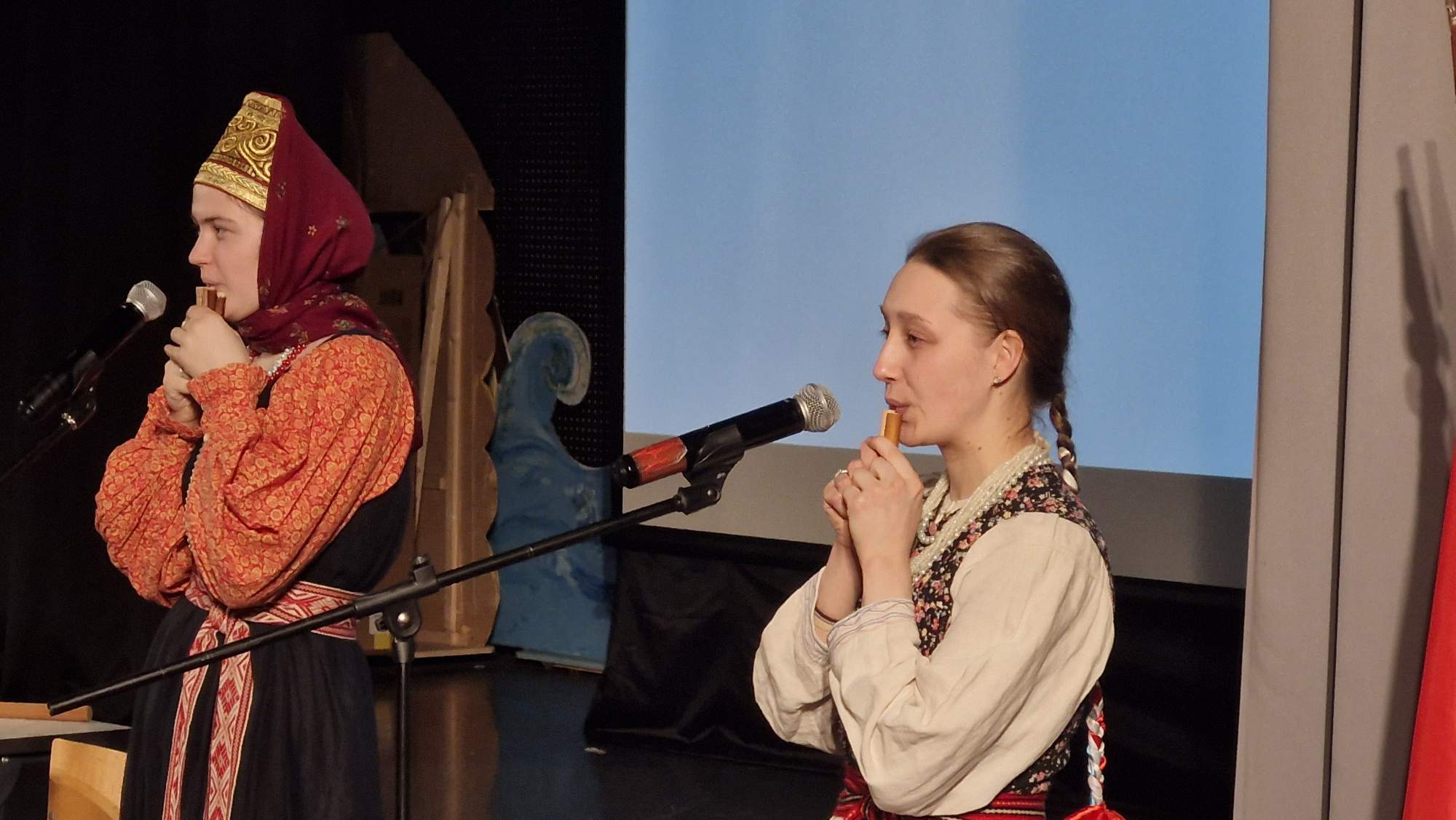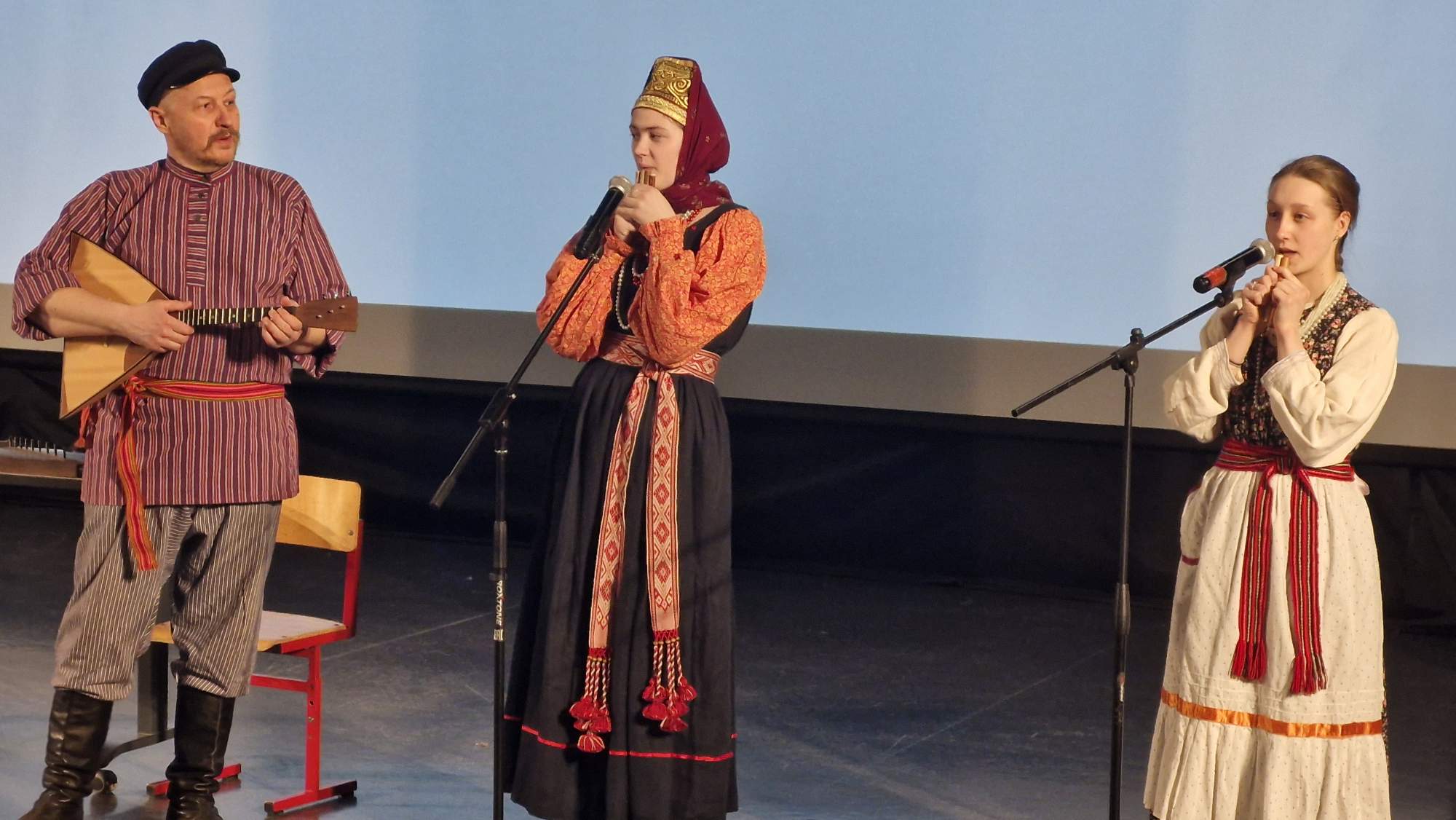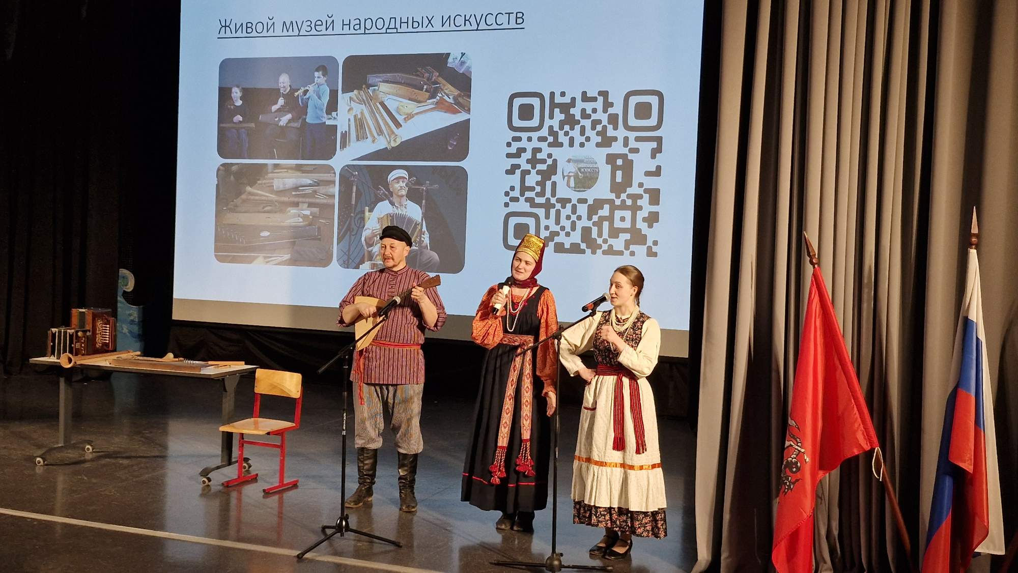 Музыка — то, что характеризует и раскрывает каждую культуру. В русской культуре популярны свои народные инструменты. Учащимся продемонстрировали игру на разных народных инструментах и рассказали про них. Кугиклы (кувиклы), наподобие флейты, делаются из тростниковых трубочек, используется камыш. Инструмент распространён в Брянской и Калужской областях. Рожок в основном использовался пастухами, чтобы загонять стадо, чаще изготавливали и использовали во Владимирской области. Гусли получили распространение в Орловской и Новгородской областях. В России существует около 30 разновидностей гармони, не все сохранились до наших времён. Учащимся школы представили елецкую рояльную гармонику. Припевки, наигрыши под гармонь назывались «Страдания», хотя это вовсе не означало что-то грустное, но носило такое название.