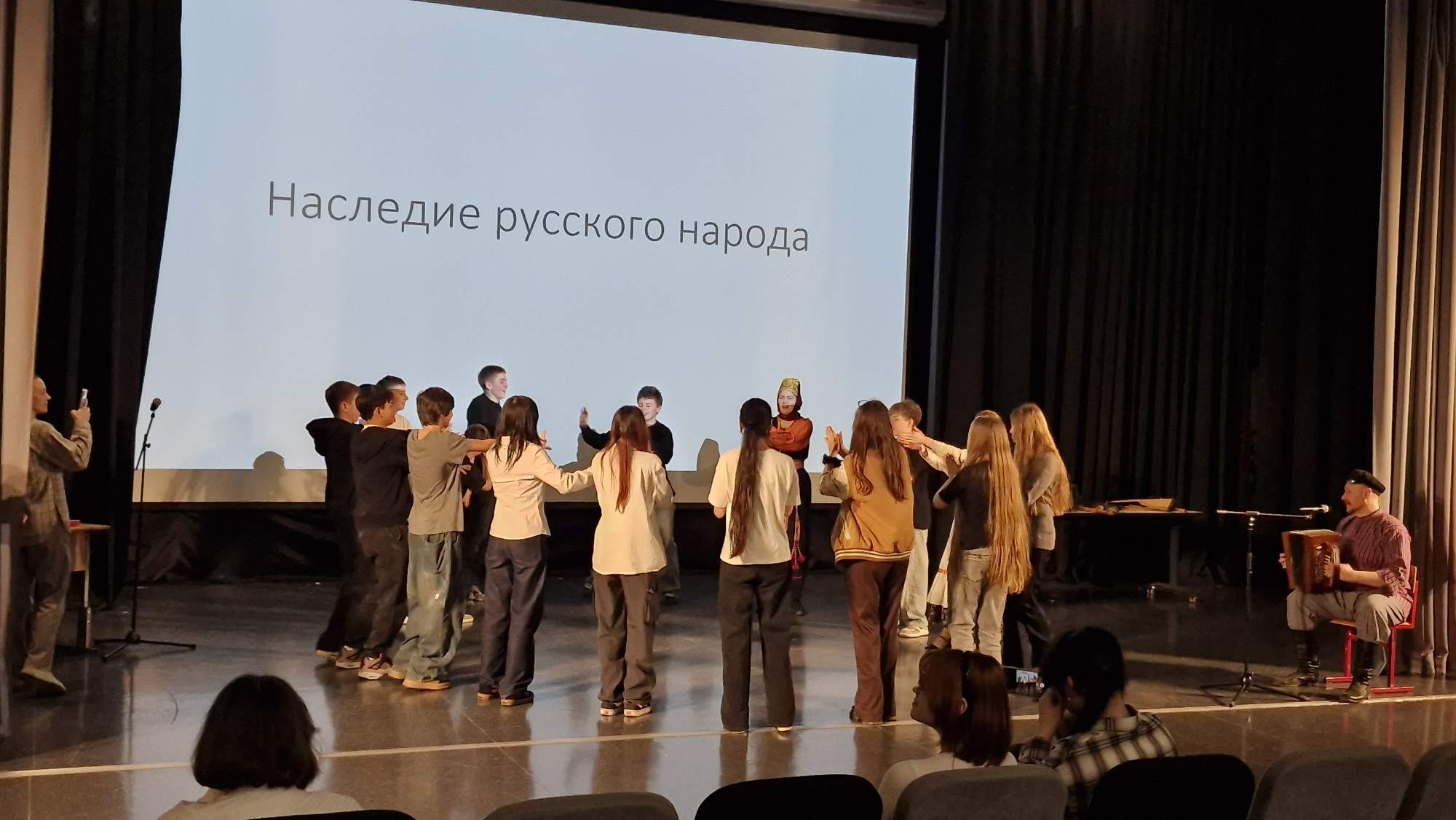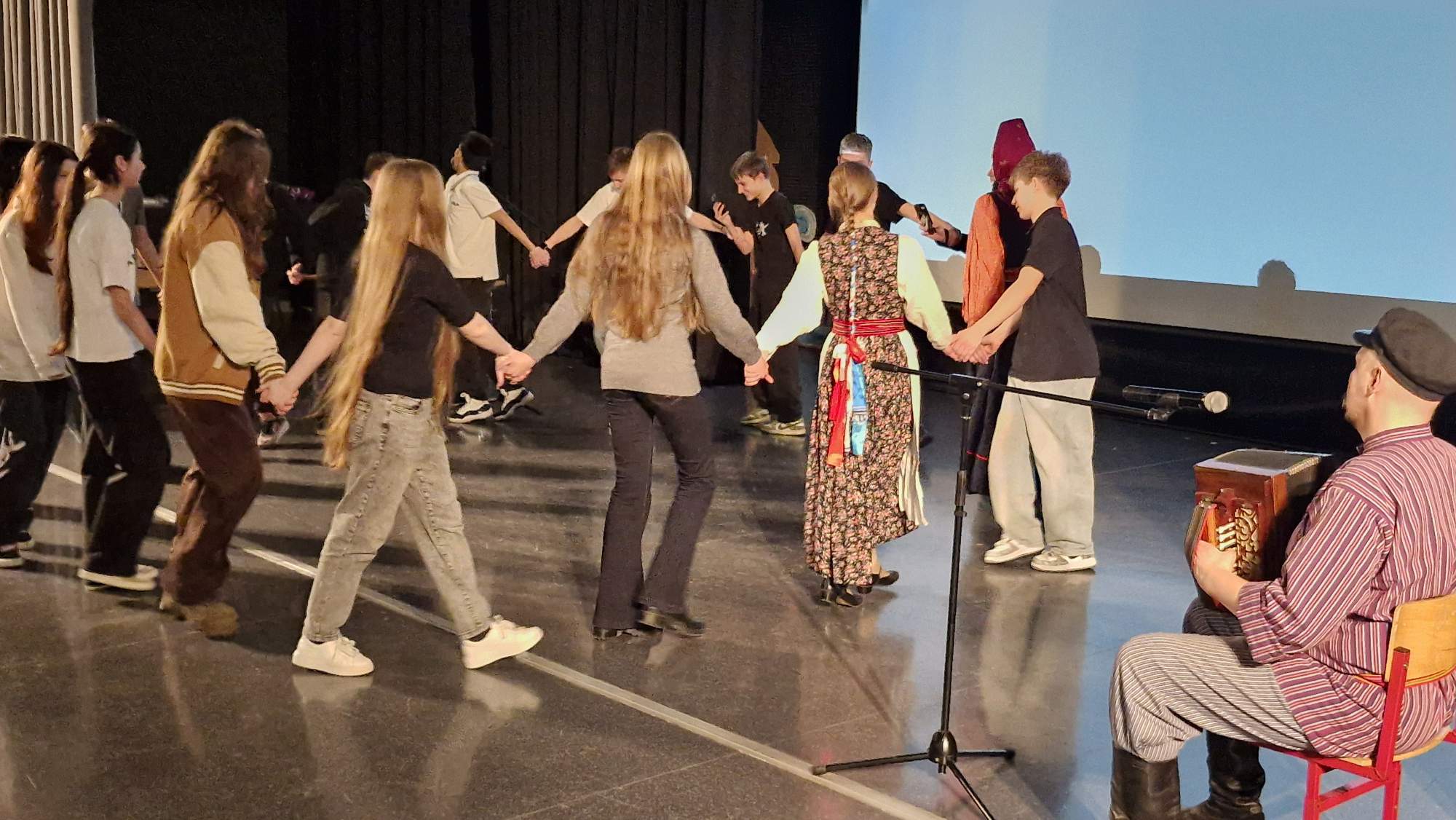 В завершение семинара артисты выступили с народной песней и провели традиционные русские игры: «Суп варить», «Семёновна» и «Матаня» под наигрыши и частушки. Притопы, прихлопы, хоровод — всё то, что сопровождает русские народные танцы. Учащимся показали движения, которые можно использовать в танцах. После танца зрители поблагодарили музыкантов припевками и поклоном.