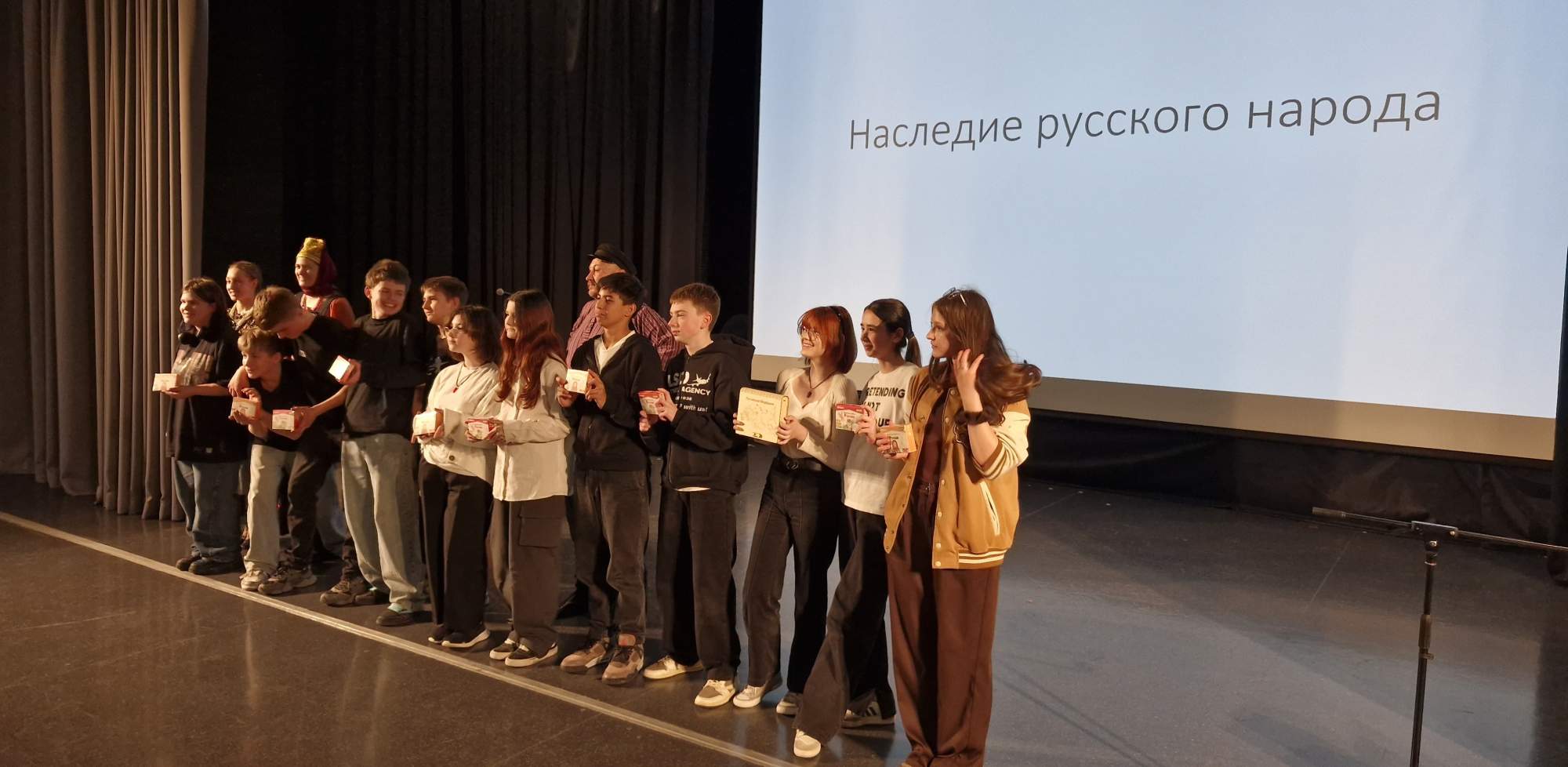 Для школьников провели викторину по русской культуре, задавали вопросы: «В каком городе изготовлена русская гармонь?», «Родина и возраст балалайки?», «Сарафан — изначально это мужская или женская одежда?», «Какой элемент одежды обязателен в русском костюме?». Правильно ответившим на вопросы викторины подарили памятные сувениры от Московского дома национальностей.